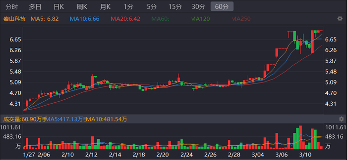 这些概念的不断加持,使得今年1月以来至今,岩山科技在资本市场上备受追捧,股价一路飙升,多次涨停,成为市场焦点。