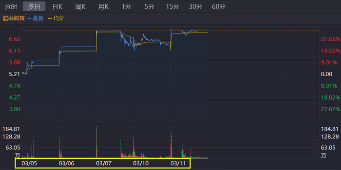 从3月4日到3月10日,短短5个交易日,岩山科技就拿下3个涨停板,累计换手率高达96.89%,累计涨幅33.78%。3月10日成交额达98.1亿元,位列A股第一,是贵州茅台的两倍。
