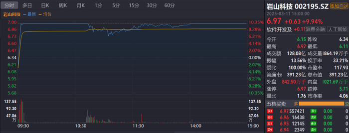 灯塔媒介3月11日讯,3月11日,岩山科技(002195)股票成交额达100亿元,股价涨幅9.94%,报收于6.97元,总市值飙升至396亿元。