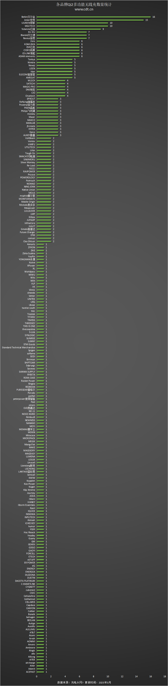 根据数据统计,通过Qi2认证多功能无线充数量第一是贝尔金,共16款;安克第二,共15款;绿联和MGCTECH第三,各10款。