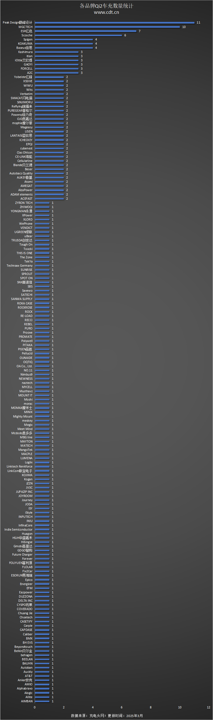 根据数据统计,通过Qi2认证车充数量第一是巅峰设计,共11款;MGCTECH第二,有10款;亿色第三,有7款。
