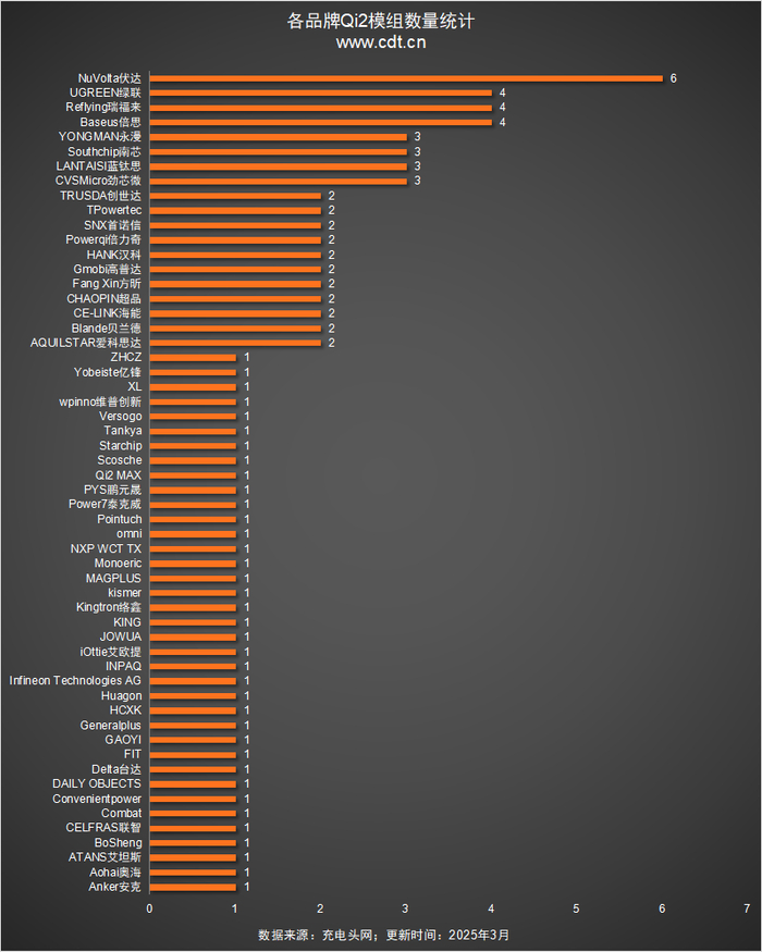 根据数据统计,通过Qi2认证无线充模组数量第一是伏达,共有6款;绿联、瑞福来、倍思并列第二,各有4款;永漫、南芯、蓝钛思、劲芯微并列第三,各有3款。