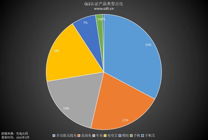 Qi2认证产品类型占比饼图可以看到多功能无线充、桌面充与车充占比前三,分别为33%、21%和19%。