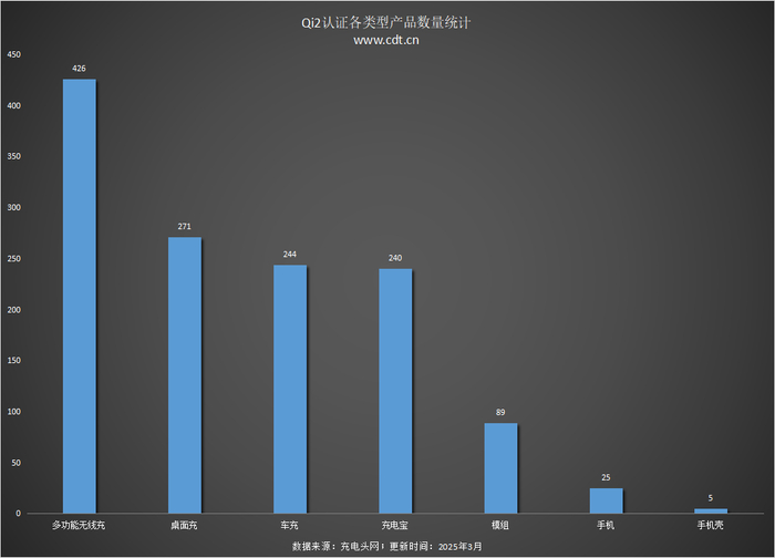通过Qi2认证多功能无线产品最多,共426款;其次为桌面充产品,共271款;车载磁吸无线充有244款通过认证;Qi2磁吸充电宝已有240款;模组有89款,手机与手机壳分别有25和5款。
