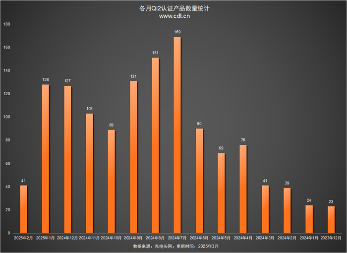 2025年2月份有41款产品通过Qi2认证,相较于前几个月有所下降。