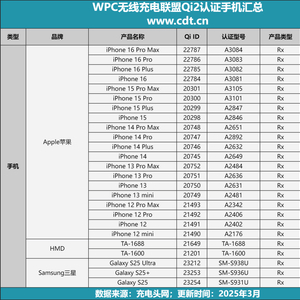 根据最新WPC认证Qi2产品统计数据,截至2025年2月28日,共有1301款产品获得Qi2认证,涉及手机、手机壳、模组、桌面充、车充、多功能无线充、充电宝等产品。苹果已有20款手机通过Qi2认证,包含iPhone 12/13/14/15/16系列手机,三星S25系列3款手机也通过Qi2认证,还有5款Qi2手机壳通过认证,让Qi2生态配件引来新一波增长。