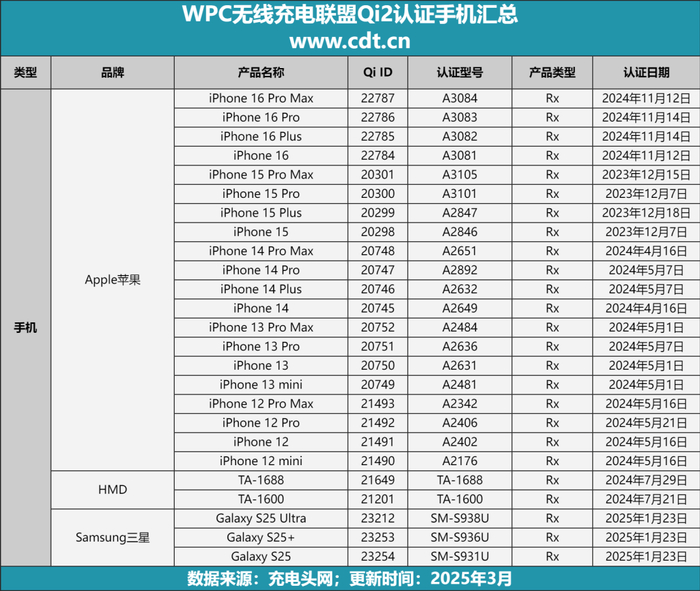 截至2025年2月28日,共有25款手机通过WPC官方Qi2认证,分别是苹果、HMD、三星。