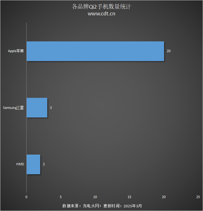 根据数据统计,通过Qi2认证手机,苹果有20款,位列第一;三星有3款,位列第二;HMD有2款。