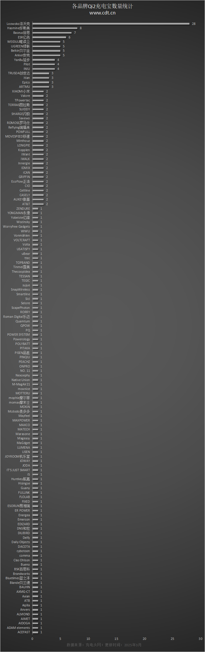 根据数据统计,通过Qi2认证充电宝数量第一是沃洛克,共28款;好斯美第二,共8款;倍思第三,共7款。