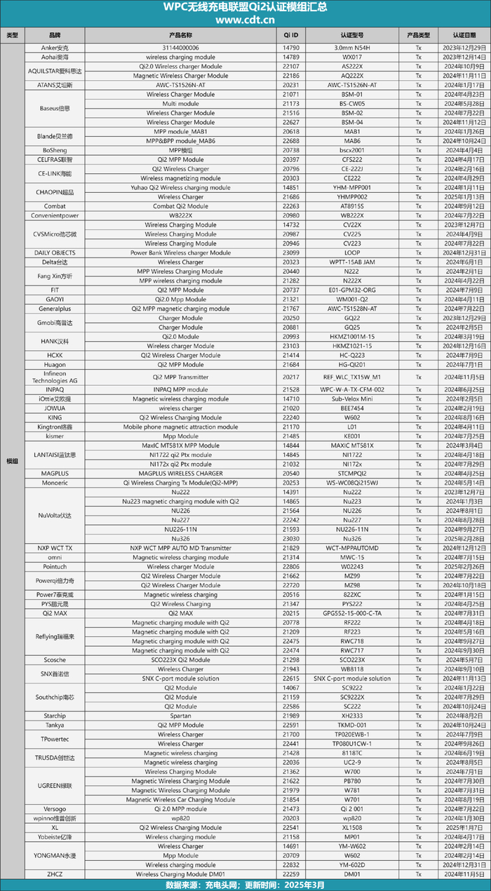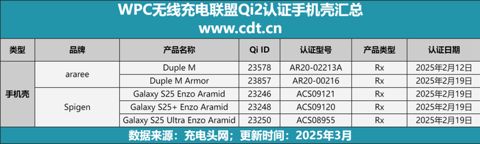 截至2025年2月28日,共有5款手机壳通过WPC官方Qi2认证。