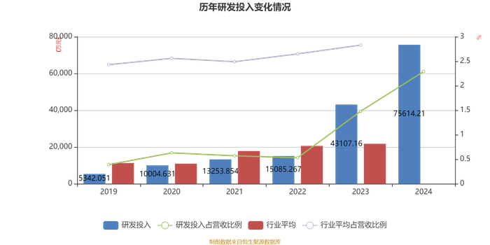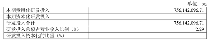 2024年全年,公司研发投入金额为7.56亿元,同比增长75.41%;研发投入占营业收入比例为2.29%,相比上年同期上升0.81个百分点。