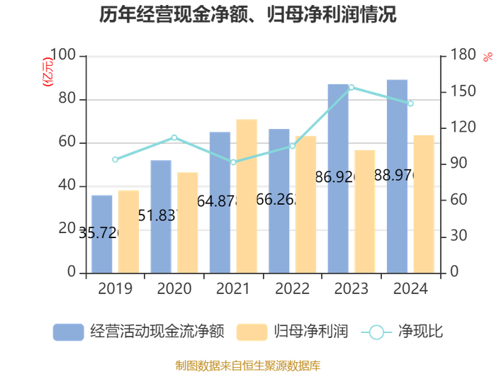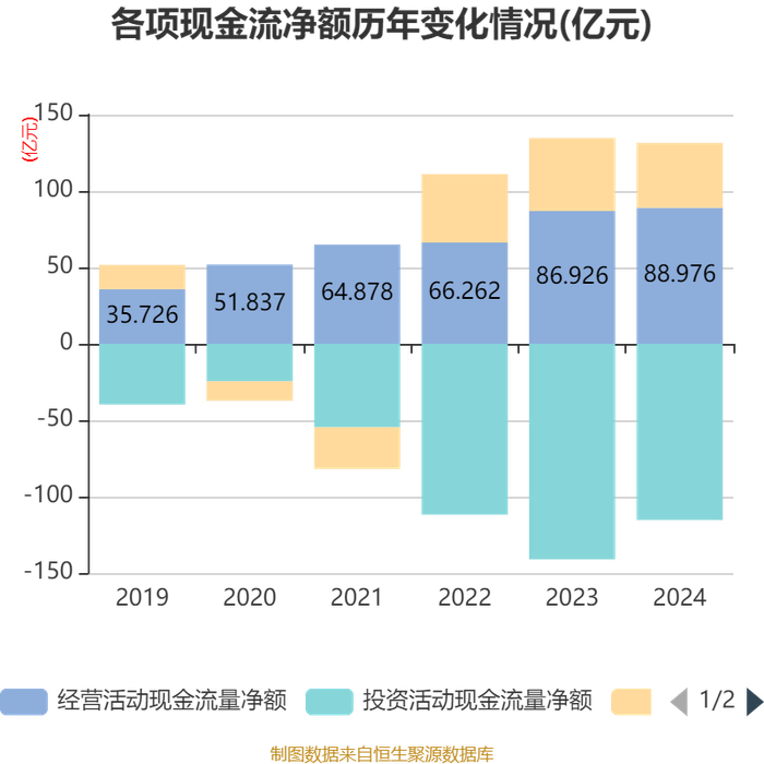 截至2024年,公司经营活动现金流净额为88.98亿元,同比增长2.36%;筹资活动现金流净额42.46亿元,同比减少5.23亿元;投资活动现金流净额-115.29亿元,上年同期为-141.01亿元。