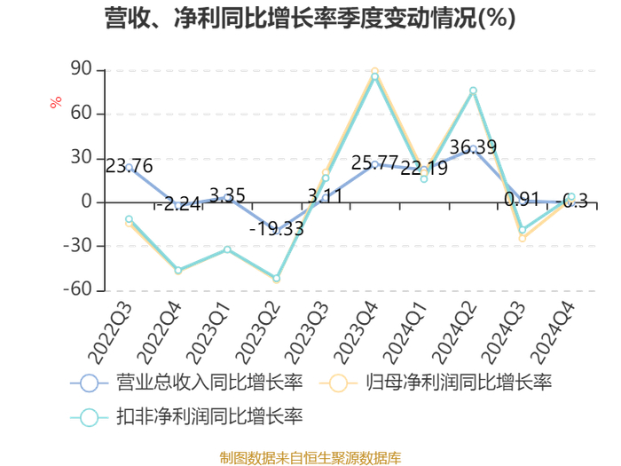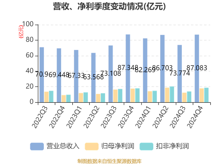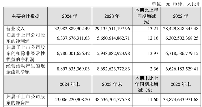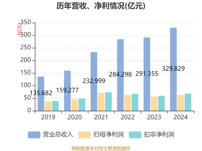中证智能财讯宝丰能源(600989)3月12日披露2024年年度报告。2024年,公司实现营业总收入329.83亿元,同比增长13.21%;归母净利润63.38亿元,同比增长12.16%;扣非净利润67.8亿元,同比增长13.97%;经营活动产生的现金流量净额为88.98亿元,同比增长2.36%;报告期内,宝丰能源基本每股收益为0.87元,加权平均净资产收益率为15.55%。公司2024年度利润分配方案为:以公司总股本为基数,拟派发现金红利30.07亿元。其中,中小股东每股派发现金红利0.4598元,大股东每股派发现金红利0.3891元。
