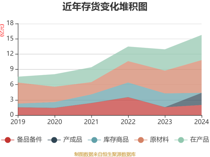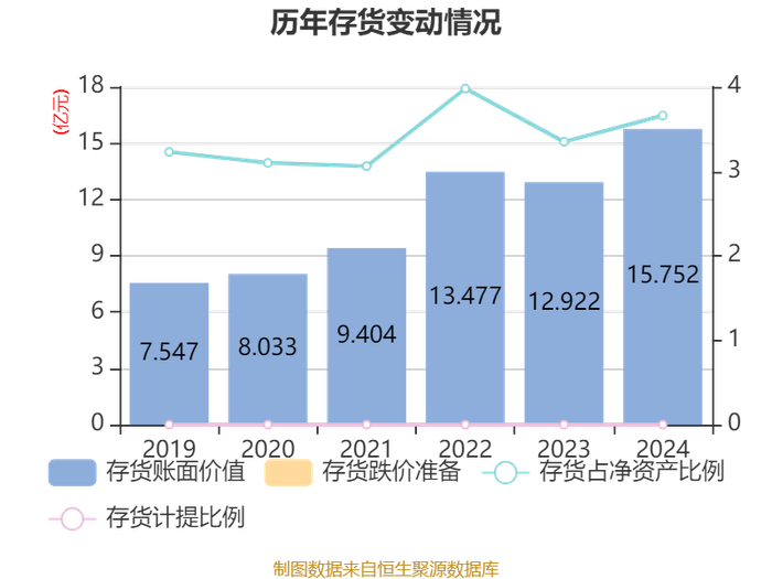 从存货变动来看,截至2024年末,公司存货账面价值为15.75亿元,占净资产的3.66%,较上年末增加2.83亿元。公司本期没有计提存货跌价准备。