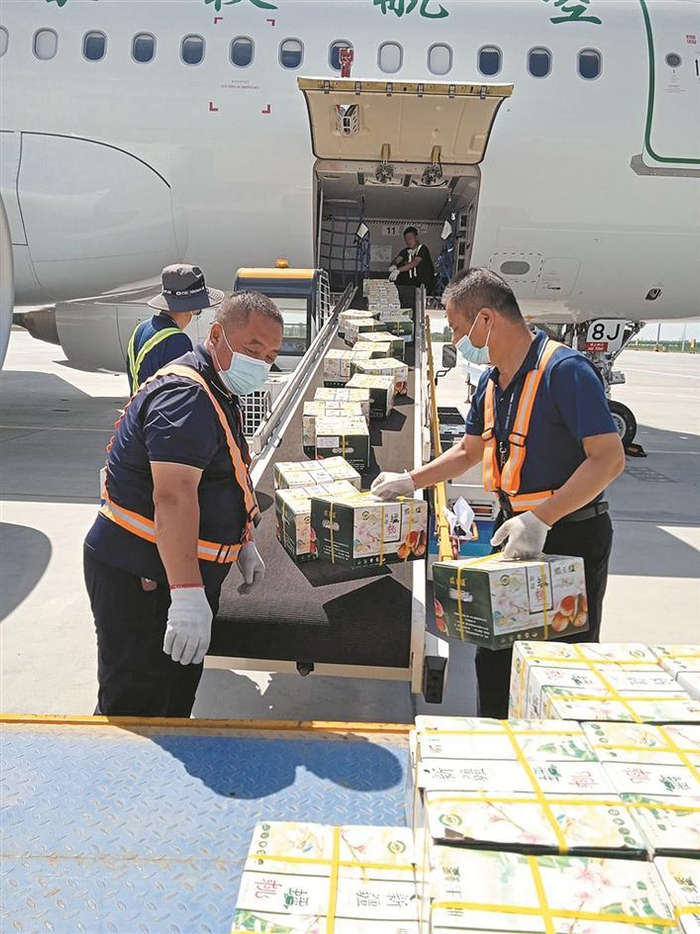 在石河子花园机场,工作人员抓紧往航班上装运蟠桃(资料图片)。石河子至天津的航空货运专机开行后,八师一四三团生产的优质蟠桃从采摘到送达天津市民的餐桌,只需30个小时。 许亚夫 摄