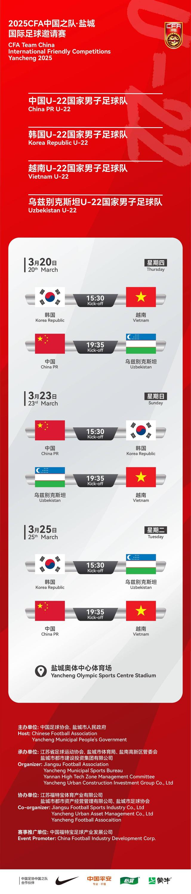2025年3月20日至25日,盐城奥体中心,让我们共同见证中国U22国家队与亚洲强队的精彩对决,为中国足球的未来加油喝彩!