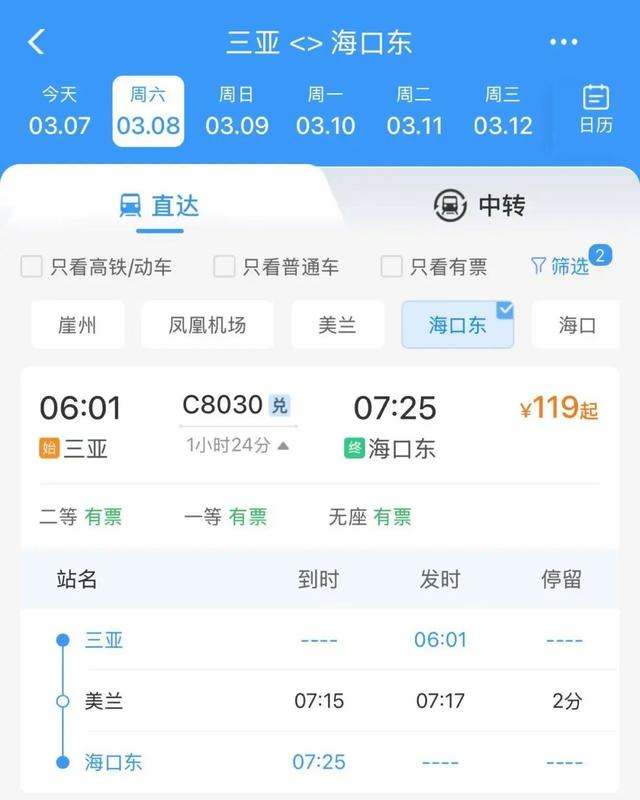 海口东至三亚间直达列车由1.5对增加至4.5对,最快只需1小时24分钟。