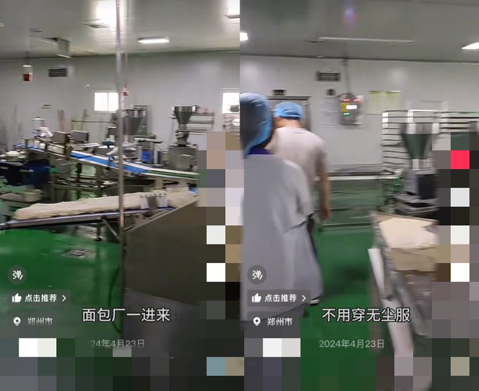 有博主在短视频平台发出的视频显示,在郑州市中牟县的一家面包厂环,面团生产车间环境杂乱,设备疑似生锈,工人身着常服于设备旁操作,“不用穿无尘服”更是成为“非常带劲”的招工吸引话术。