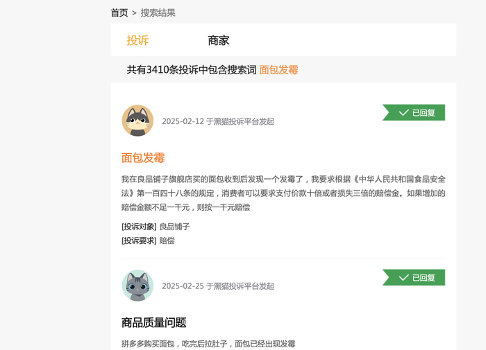黑猫投诉平台上,关于“面包发霉”的投诉有3410条,关于“面包异物”的投诉有1496条,关于面包内现头发、金属等的投诉有2082条。