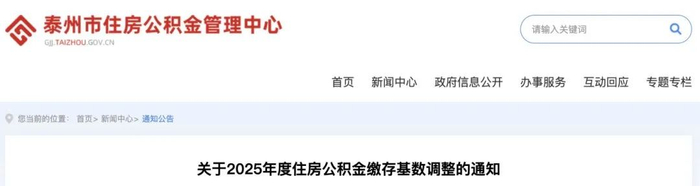 泰州市住房公积金管理中心发布《关于2025年度住房公积金缴存基数调整的通知》。