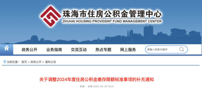 2月20日,珠海市住房公积金管理中心发布《关于调整2024年度住房公积金缴存限额标准事项的补充通知》。