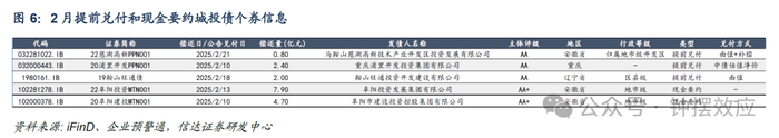 2月城投债实际提前偿还规模较1月环比大幅下降80亿至18亿元,公告提前偿付规模环比也同步下降。2月共5只债券提前偿还,较1月减少20只,累计兑付金额18亿元,较1月大幅减少80亿元。其中提前兑付3只,现金要约2只。而根据企业预警通数据披露,2月有14只城投发布债券持有人会议公告拟提前兑付,较1月增加3只,拟兑付金额23.6亿元,较1月下降32.1亿元。此外,2月有2只城投发布持有人会议公告拟现金要约购回债券,较1月减少1只,拟购回规模12.0亿元,现金要约购回规模较1月减少6.10亿元。