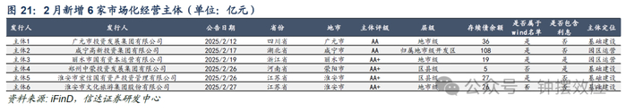 其中需要关注的是“淮安市文化旅游集团股份有限公司”、“淮安市宏信国有资产投资管理有限公司”和“咸宁高新投资集团有限公司”等3家发行人在23年12月至25年1月发行过协会公募债产品,其募集说明书并未披露其为市场化经营主体,但25年2月发行人协会产品募集说明书声明其为市场化经营主体,我们认为这类平台可能已经实现了退名单,但其相关指标还未达到协会标准,因此可能仍被认定为城建类主体,目前它们在协会发债的用途可能仍仅能借新还旧,相关政策或尚未放松。