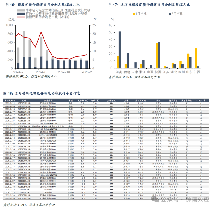 2月城投发债借新还旧覆盖利息的规模环比下降28.9亿至195.9 亿元,且相关债项绝大多数为协会产品,占全部借新还旧用途发债的比重上升0.7个百分点至8.0%,除了部分产业属性相对较强的主体外,多数为市场化声明的平台。河南、福建等6个省市覆盖利息的规模占比增加。进一步梳理城投发债借新还旧是否能够包含利息的情况,2月借新还旧中能够覆盖利息的城投债发行规模为195.9 亿元,相关债项绝大多数为协会产品,除九江富和建设投资集团有限公司、江苏瀛洲发展集团有限公司和杭州市城市建设投资集团有限公司,其余发行人均为声明市场化经营的主体;总体规模较1月下降28.9亿元至195.9亿元,占全部借新还旧用途发债的比重上升0.7pct至8.0%。2月城投发债用于借新还旧且能够覆盖利息的省市共11个,其中包含1个重点省份天津,其中河南、福建和天津等6个省市借新还旧能够覆盖利息规模占比较1月有所增加,江西、山东等5个省市借新还旧能够覆盖利息规模占比较1月有所降低。