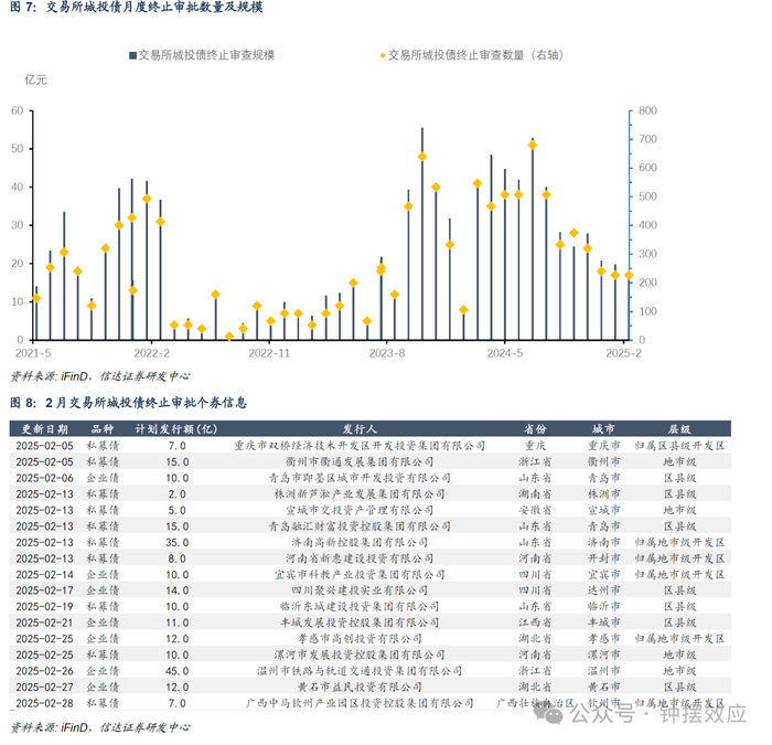 2月交易所终止审批规模环比有所减少。2月交易所终止审批城投债共17只,终止审批数量与1月持平,但2月终止审批拟发行规模228.00亿元,较1月减少33.58亿元。