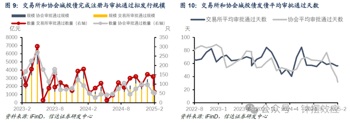 2月交易所城投债审批通过规模大幅下降,而协会略有回升,交易所平均审批通过天数持平于约57天,协会平均审批时间降低至约32天。剔除未披露注册进程债项和ABS债项后,2月交易所城投发行审批通过数量由1月的140只降至57只,但通过规模较1月减少1219亿至883亿元;协会城投发行审批通过数量则由1月的55只降至52只,但规模较1月小幅增加16亿至486亿元。我们根据交易所审批通过、协会完成注册日期与该债项最早已受理日期进行匹配来推测城投债平均发行审批所需天数。交易所2月城投发债平均审批通过天数约57天,交易所平均审批通过天数较1月增加约0天,协会城投发债平均审批通过天数为约32天,协会平均审批通过天数较1月降低约7天。