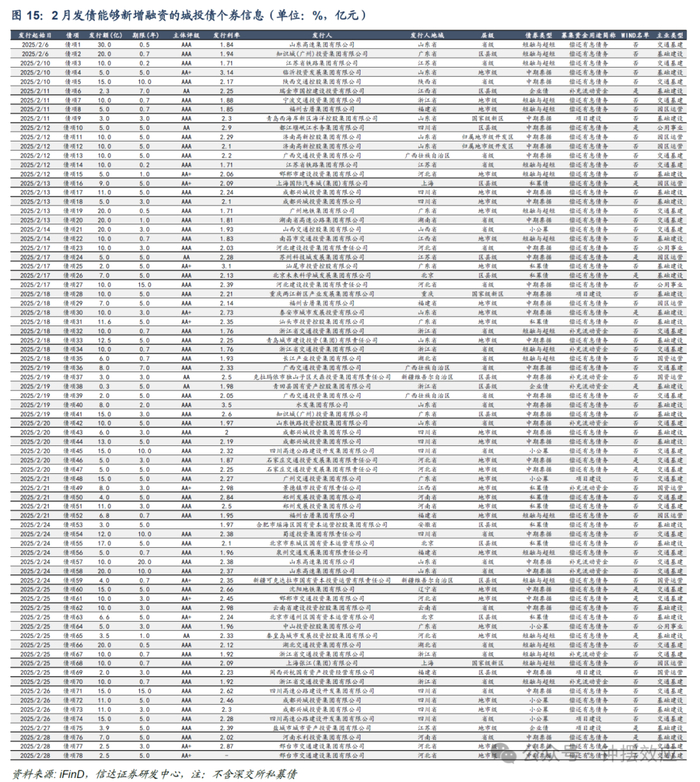 在新增融资主体中,2月协会产品发行58只,发行规模555亿元,其中偿还有息债务47只,补流8只,项目建设3只,发行规模分别为457亿元、83亿元和15亿元。偿还有息债务主体中,国资运营主体2只,交通基建主体20只,公用事业主体3只,园区运营主体7只,基础建设主体15只。补流和项目建设主体中,国资运营主体2只,交通基建主体7只,基础建设主体2只。在2月协会新增融资主体中,仍有9家主体尚在Wind城投名单上,其中4家为交通基建主体,园区运营主体1只,公用事业主体1只,基础建设主体3只。其中,基建类主体邯郸市交通投资集团有限公司实控人为邯郸市国资委,主要负责邯郸市交通基础设施建设与运营,本次发行中票用于偿还发行人本部及合并报表子公司的有息债务;石家庄交通投资发展集团有限责任公司实控人为石家庄国资委,是石家庄市重点打造的5家大型国有企业集团之一,承担了石家庄市高速、轨交等主要交通基建及配套项目投融资、开发建设和运营管理,本次发行中票用于偿还发行人及下属子公司银行贷款、信托贷款等有息债务;沈阳地铁集团有限公司实控人为沈阳市国资委,负责沈阳市地铁建设及运营、公租房建设及租赁等业务,本次发行中票用于偿还有息债务。