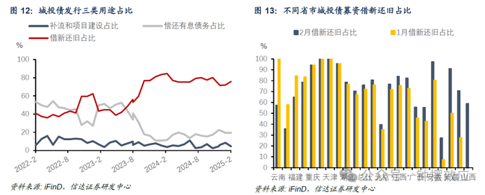 2月城投发债用途为借新还旧的比重抬升3.81pct至75.9%,补流和项目建设的比重开始回落。剔除定向工具及部分未公开披露募集说明书的债项后,2月“借新还旧”、“偿还有息债务”、“项目建设和补充流动资金”三类城投债募集资金用途分别发行2456亿元、630亿元和150亿元,占比分别为75.9%、19.5%和4.7%,其中借新还旧占比较1月抬升3.81个百分点,偿还有息债务占比较1月上升0.05个百分点,项目建设和补充流动资金占比较1月下降3.85个百分点。