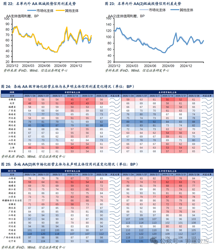 我们将在募集说明书里面声明“市场化经营主体”的平台定义为名单外平台,其他 Wind有存续债的平台定义为名单内平台,考虑到部分 Wind 有存续债,且没有声明“市场化经营主体”的高速、交运等类型平台有可能是名单内平台,也有可能被定义为产业类平台,因此该分类或有一定的误差,但是考虑到目前没有公开信息可以做进一步的细分判断,我们暂时按照名单内平台来定义。我们取2023年2月25日后发行的所有城投债样本,按照中债隐含评级进行分类,对样本内同隐含评级债券的信用利差取算数平均数,从而制定了中债隐含评级分别为 AA 和 AA(2)的名单内外平台利差估值曲线。