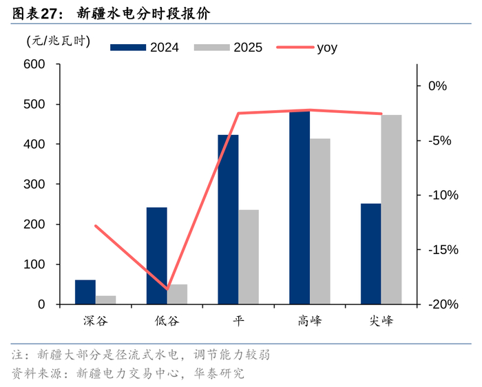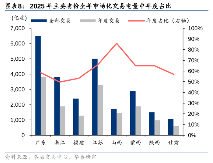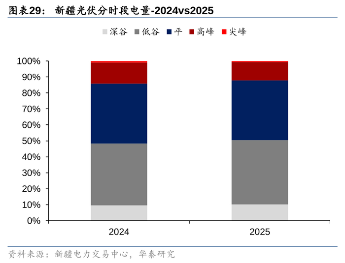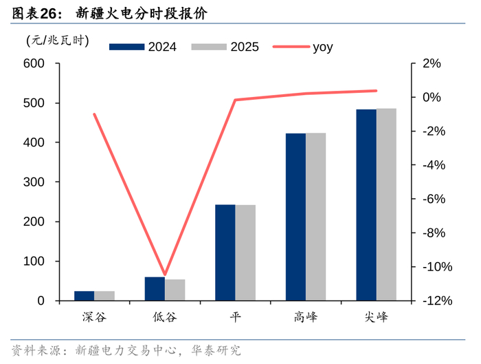 随着风光的渗透率提升,2025年年度交易量中光伏同比增长81%,风电同比增长46%,风光占比从2024年的27%提升至30%,火电占比从66%下降至63%。光伏的高速增长拉低了谷段和深谷段电价,火电在谷段和深谷段报价分别同比下降1.0%和10.5%,但是调节能力相对较弱的径流式水电两段报价分别下降12.8%和18.6%,体现了火电在低价时段对价格和电量的控制能力。火电平段报价虽然略降,但是峰段和高峰期报价均同比上调。同时,火电下调了谷段和深谷的电量比例(从33%至32%),从而实现整体加权平均交易均价同比上涨0.3%。光伏虽然除了尖峰段其余时间的成交均价均有所提升,但是因为谷段和深谷的电量占比从38%增加至50%,尖峰和峰段电量占比从14%下降至12%,所以整体出清均价从165.69元/兆瓦时下降0.6%至164.77元/兆瓦时。