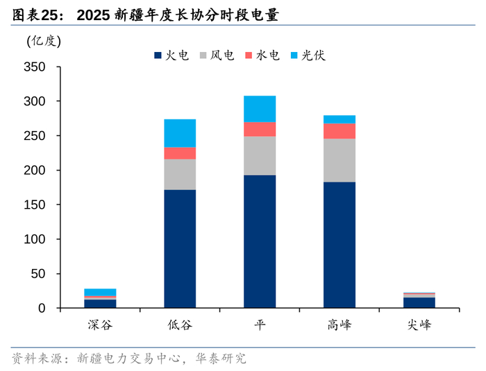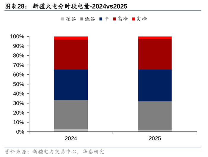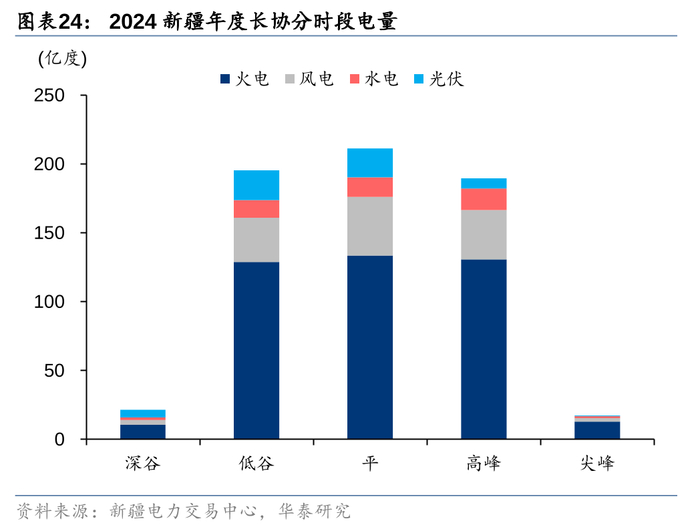 我们以新疆2024-25年度交易为例来说明新能源不断增加后对火电电价的影响。新疆电力市场有两大特点:1)新疆2024年风光发电量1162亿度已经接近2025年度交易整体1175亿度,根据能源局公布的数据2024年风电和光伏消纳率仅93%和92%,在全国所有省份中仅高于青海与西藏;2)新疆火电的煤炭采购多为坑口,煤电成本稳定且低,所以煤价对电价本身的影响不大。