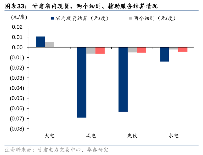 基于我们可以获取的煤电交易与结算电价数据,煤电结算电价相对煤电交易电价平均溢价在1-2分/度,这部分差别主要是由于现货市场、分摊考核补偿、“两个细则”辅助服务等因素产生的。这个差值涵盖了盈余阻塞分摊、不平衡资金分摊等科目,所以波动较大,但是至少部分体现火电因为其调节能力而获得的溢价,参考甘肃省的结算情况也可以得出类似结论(图表33).