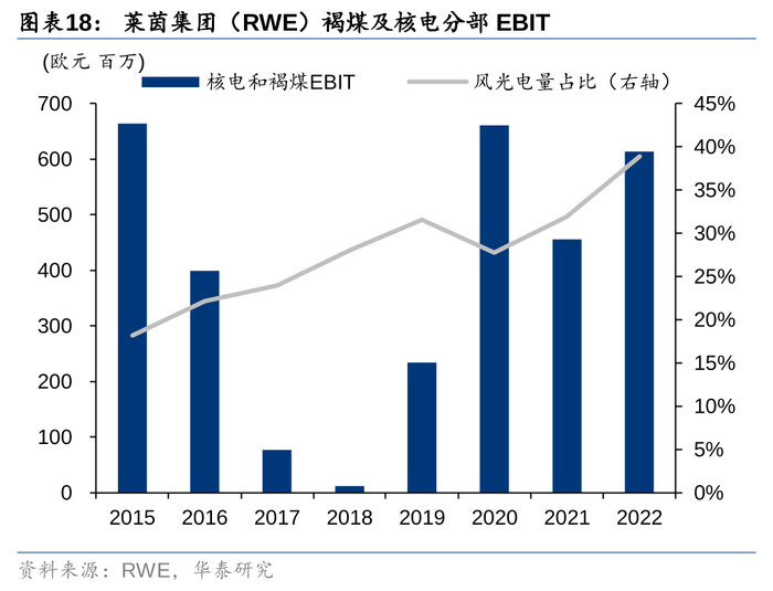 但是我们要说明2020年疫情导致全球需求低于预期(硬煤利用小时1878),进而导致电价突发性下降及高频的负电价,但其实2020年德国电力公司的收入大部分在2020年之前就通过长期合同锁定了。以德国最大的电力公司莱茵集团的利润对比(图表18),不难发现:2020年虽然疫情导致需求偏弱,利用小时骤降,批发电价大幅度下降,理论测算的点火价差为负(图表17),但其实发电企业因为电价提前锁定,燃料成本下降,实际的盈利非常高。