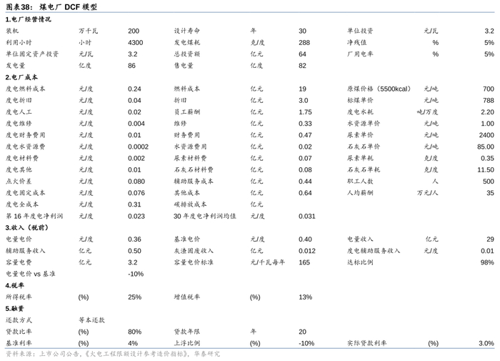 我们建立DCF模型对煤电公司的盈利进行预测,参考《火电工程限额设计参考造价指标》假设煤电单位投资为3.2元/瓦,发电煤耗我们参考能源局公布的2024年数据288千克度,火电机组寿命30年会计折旧20年(净残值5%),厂用电率5%。收入端灰渣固废收入与成本端的人工、材料、维修等费用参考甘肃能源、华电国际、淮河能源等资产注入的公告。融资方面,假设项目资本金20%,贷款利率4%,等本还款。