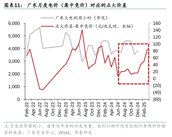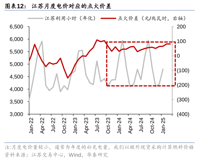 高频的月度价格也是个很好的佐证:广东省2021年后利用小时就下降至不足4,200,2024年火电利用小时更跌破4000,但是广东2025年3月的月度电价(价格通常更低的集中竞价)对应的点火价差已经恢复到0.08元/度,当然这有淡季火电厂检修的原因,但是在煤价持续下降的过程中,火电电价可以环比回升,至少部分反映了火电的定价权。同理,江苏火电统调利用小时2024年已经下跌至4230(江苏能监办官网),但是2025年2-3月月度电价的点火价差也都超过了0.08元/度,月度电价的下降幅度显著低于煤价下降的幅度。