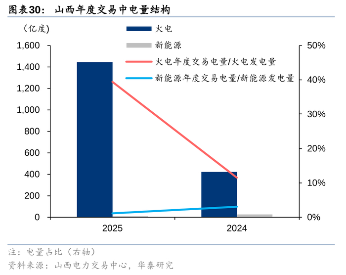 以市场化先锋省份山西为例,作为第一个正式上线电力现货市场的地区,2025年山西年度交易中新能源电量占比已经低于0.7%;新能源考虑到自己波动的风险,对曲线事前分解要求较高的年度合约不会过多暴露头寸,而是等到月度和日前再做交易。这本身也会增加火电在中长期交易中的定价权。和新疆一样,因为年度交易有时间段要求,所以整体新能源中长期电价与火电趋势一致,但始终低于火电。