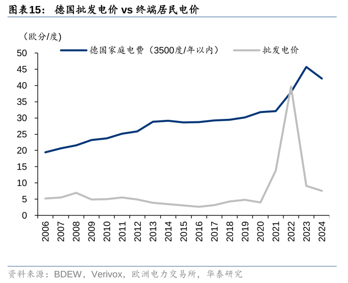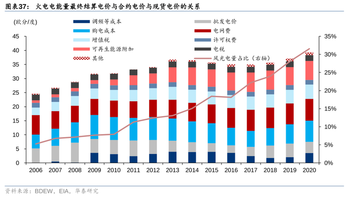 未来调峰功能会更多通过现货实现,但是调频需求依然很大。参考德国终端电价的构成,随着新能源占比持续增加,调频等费用在购电成本中不断上升,加上电网费与可再生能源补贴的持续上升,是德国终端电费攀升的主要原因。