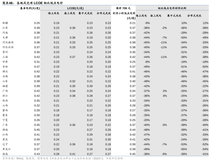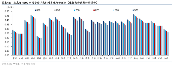假设“十五五”利用小时低点火电可以支撑0.08元/度的点火价差(相比2025年度长协的时候低0.02-0.03元/度),我们根据各省煤价、运费、历史点火价差与未来利用小时的变化测算电量电价如下图43;我们的理论测算考虑目前基准上下浮动20%的规则不变。