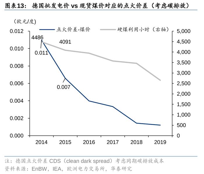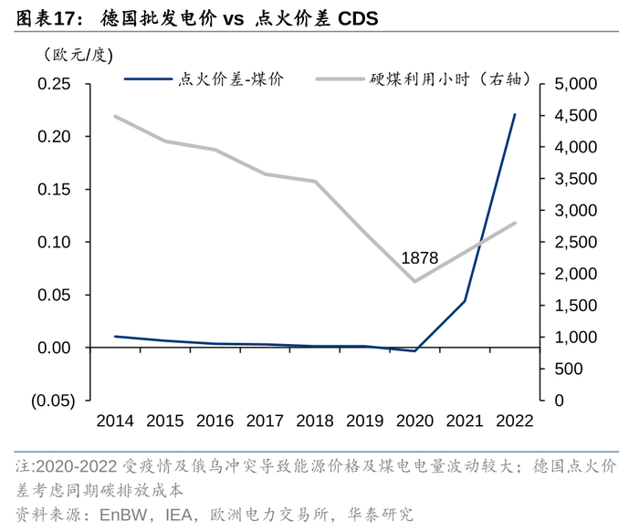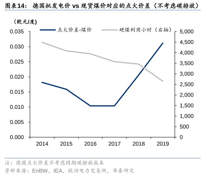参照德国转型经验:硬煤利用小时跌破4300时,点火价差约0.11人民币元/度