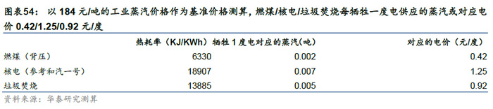 若以184元/吨的工业蒸汽价格作为基准价格(连云港市2020年以来蒸汽价格最低值),我们测算燃煤/核电/垃圾焚烧每牺牲一度电供应的蒸汽或对应电价0.42/1.25/0.92元/度。参考实际项目,我们取燃煤/核电/垃圾焚烧项目的热耗率分别为6330/18907/13885KJ/KWh,则每少发1度电对应0.002/0.007/0.005吨蒸汽,以基准汽价计算对应的电价为0.42/1.25/0.92元/度。
