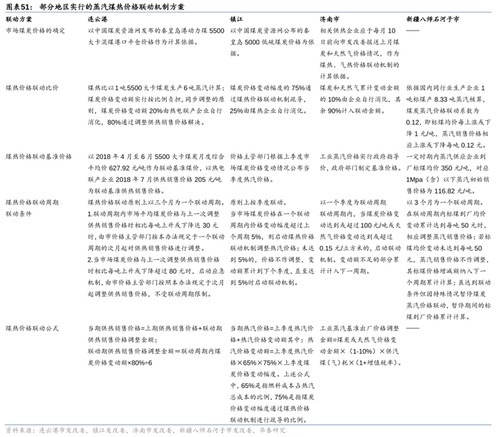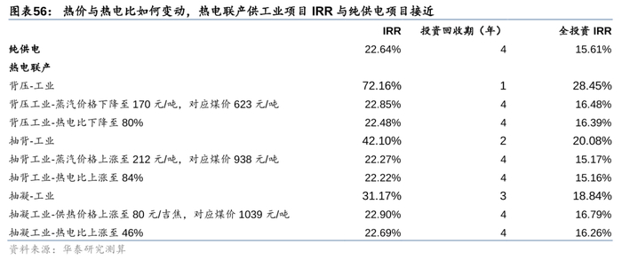 我们建立DCF,对燃煤供热经济性进行分析。主要比较纯供电、热电联产、纯供热三类项目的经济性,其中考虑燃煤热电联产项目涉及的汽轮机存在差异,将燃煤热电联产细分为三种类型:1)背压式机组,2)抽背式机组,3)抽凝式机组;每种类型中又拆分为供居民、供工业两种情形。经测算,我们发现IRR视角下,热电联产(供工业)>纯发电>热电联产(供居民,抽凝除外)>纯供热。测算结果表明,热电联产(供工业)项目供应工业蒸汽带来的经济效益,超过了损失的发电量减少的经济效益,即该类项目实际收益率与供工业热价、热电比紧密相关。DCF测算中我们假设蒸汽价格为192元/吨(适用于背压、抽背项目)、热量热价为65元/吉焦(适用于抽凝项目),在此基础上,我们测算发现1)额外供热(工业热电联产)或将带给火电6.85pct的全投资IRR增厚(背压、抽背、抽凝项目均值)