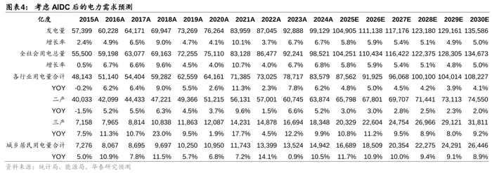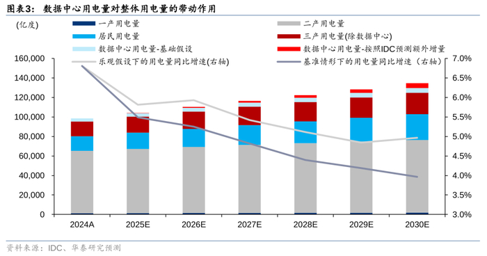 在上述数据中心的用电量测算下,2026年用电量增速会达到6%左右,相比2025年有所提升。2025-30年数据中心用电量CAGR高达25%,带动“三产”用电量增速从6%增加至9%,全社会用电量增速从4.5%增加至5.3%(“十五五”CAGR)。