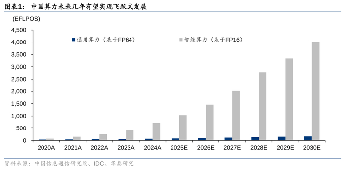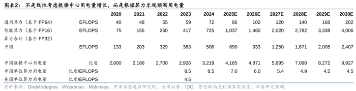 根据IDC的预测2024-28年算力增速35%-40%,我们测算用电量增速2026-28年达20%以上。需要说明的是,因为芯片、能耗、冷却技术及数据中心位置的不同,美国单位用电量远低于中国,我们假设未来我国单位能耗持续下降,所以用电量增速显著低于算力增速。