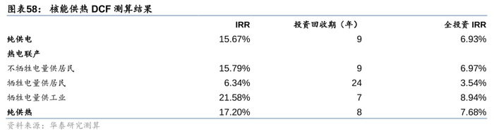 经测算,我们发现IRR视角下,热电联产(牺牲电量供工业)>纯供热≈热电联产(不牺牲电量供居民)≈纯发电>热电联产(牺牲电量供居民)。测算结果表明,额外供热(工业热电联产)或将带给核电2.01pp的全投资IRR增厚,即热电联产(牺牲电量供工业)项目,如江苏徐圩一期项目,因供应工业蒸汽带来的经济效益,超过了因损失发电量而减少的经济效益,即该类项目实际收益率与蒸汽价格紧密相关。DCF测算中我们假设蒸汽价格为192元/吨,在此基础上,我们测算发现当蒸汽价格下降27%至140元/吨时,热电联产牺牲电量供工业项目IRR与纯供电项目接近。