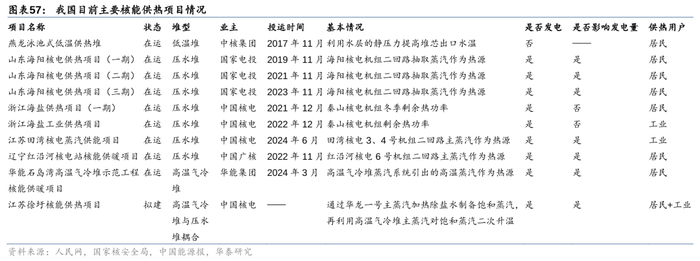 2024年8月国务院核准的江苏徐圩核能供热发电厂项目(一期)是国内首个以供汽供热为主要目的,兼顾电力供应的项目。采用我国具有完全自主知识产权的第三代核电技术华龙一号和第四代核电技术高温气冷堆耦合的方案建设核能供热系统,拟建设2台华龙一号压水堆核能发电机组和1台高温气冷堆核能发电机组,配套建设蒸汽换热站。首次采取以热定电的运行模式,通过华龙一号主蒸汽加热除盐水制备饱和蒸汽,再利用高温气冷堆主蒸汽对饱和蒸汽二次升温,建成后设计工况下将同时具备高品质蒸汽供应能力和发电能力。