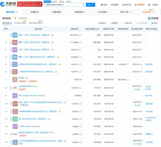 股东信息显示,该公司由桑蓬(上海)科技合伙企业(有限合伙)、比亚迪(002594)、软通动力(301236)等共同持股。此外,彭志辉(稚晖君)通过桑蓬(上海)科技合伙企业(有限合伙)间接持股上海智元新创技术有限公司。